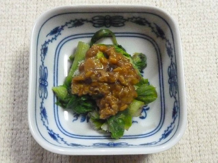 レンジでチ~ンし水に放ちアク抜きします。味噌との相性が宜しい蕗。戴きましたもろみ味噌で和えますと春を告げる蕗の薹の苦みが堪りません。