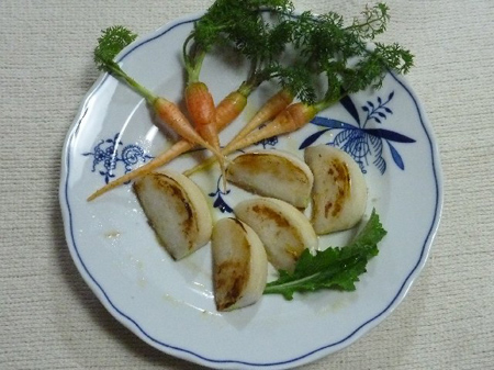 簡単ではありますが、細人参は生食。蕪はチョイト焼き目を付けオリーブオイルとスモークソルトのシンプルさで味わえば素材の甘さが広がりました。