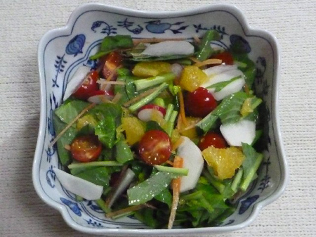 小松菜はアクが少ないのでサラダで合わせるは菜園産蕪と人参。丁度夏みかんを戴きましたのでドレッシング替わりの甘酸っぱさが広がります。