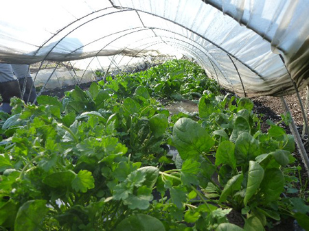 雑草を除去し陽を葉一面に受けて喜ぶチジミほうれん草です。