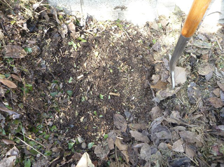 庭隅に落ち葉を積んで堆肥を作って活用しています。昨年秋の落ち葉を除け完熟部分を掘り出します。