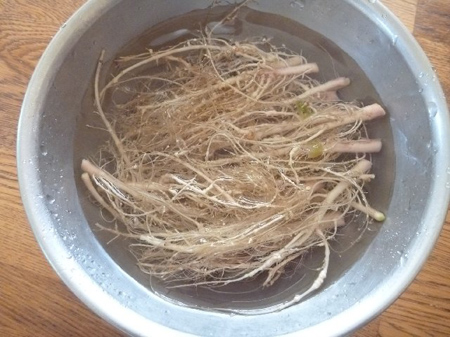 根小屋の土壌は微細で肥沃な黒土です。茎が折り重なっている根元部分の土を落とすことが出来ません。葉の部分は王道のお浸しで戴き、根元部分に包丁を入れ、土をハブラシで落とします。