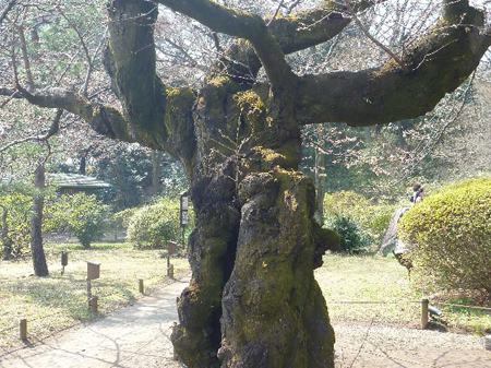 木肌に年月を感じる桜樹。ポッターの暴れ柳を連想させた。薄暮の時刻に動き出せば怖いでしょうね。