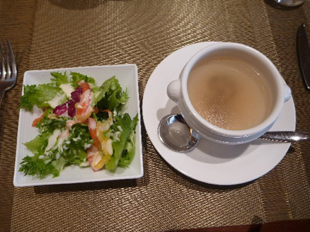 1時間ほど公園内で時間を過ごしOrient Caféの席に案内される。 卓前の紙ナプキンにKOIWAIの文字ありで尋ねると岩手県小岩井農場のお店との事。 サラダとスープが供される。
