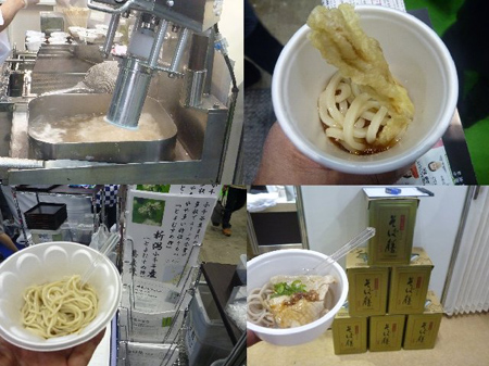 蕎麦打ちの修行をしなくても蕎麦製造システムを導入すれば即開業と実演していました。 方法はところてん方式で二八も十割も簡単に作れます。が売りです。麺と言えば天麩羅、舞茸生産者はうどんで試食。醤油生産者も美味しい汁で勝負し商売繁盛と訴えています。 その他にもデュラムセモリナ粉と蕎麦粉4割で生パスタピツォッケリの試食もありました。