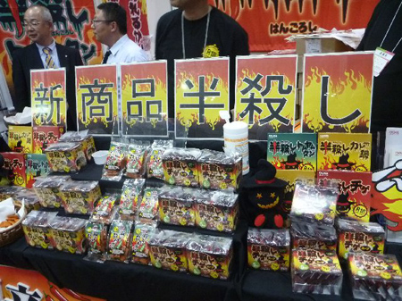 何やら物騒な名で近寄りがたいブースあり。おそるおそるR18指定の「半殺しおかき」を試食してみました。ギヤー!!火を噴くゴジラの気分です。 麻布十番梁山泊の料理に「火の鳥」と言う唐揚げがあります。かなりの辛さで癖になる料理ですが、それ以上の刺激ですね。 試供品として「半殺しチゲスープ」「半殺しカレースープ」「半殺しおかき」を頂戴いたしました。味わうには勇気がいりますね。HPを閲覧しましたら話題沸騰50,000食突破とありました。興味を示された方はオンラインショップで入手可能です。 http://www.kokonoe-shop.com/fs/kkne1772/c/hangoroshi
