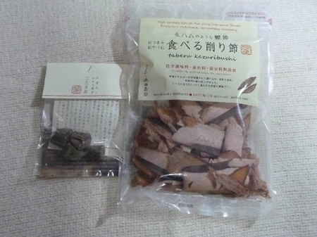 分けて戴きました「こだま節」「食べる削り節」。こだま節はこれ以上削れない部分を商品としたのでしょう。醤油にポーンと入れればだし醤油となります。 食べる削り節は味付けがなされており、和洋何でもござれでチーズを載せればワインがすすみます。