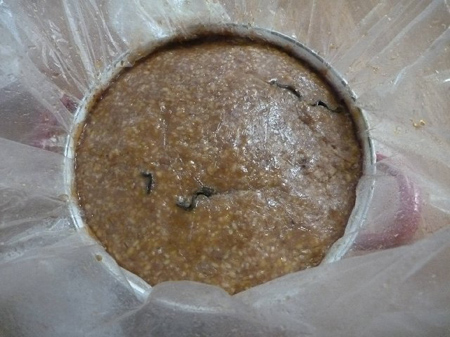 北海道南かやべ産天然真昆布も挿してあります。遮光の為の化粧箱に溜まりが溢れていました。麦麹は発酵が進むのが早いようです。