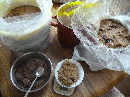 持ち帰った味噌10kgを半分にし米麹1 kgと麦麹1 kgを加えました。