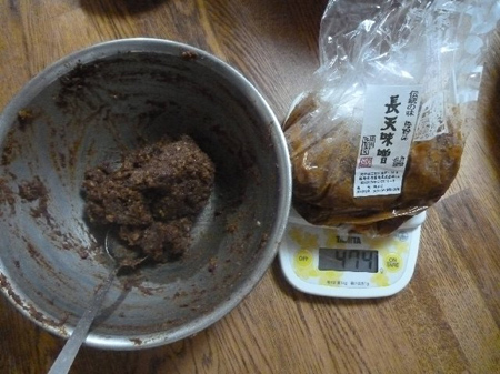 残りの長天味噌は470gでしたので手前味噌230gを2対1で合わせます。