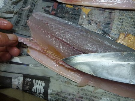 そして腹ヒレの繋がっている部分を切り、腹を下にして頭の部分から背骨を断ち切ります。