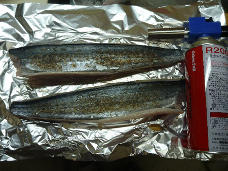 塩を振り急ぎ求めてきましたトーチで焼き霜作りにします。何しろトーチを扱うのは初めてであり、剣呑ですので外で炙ります。