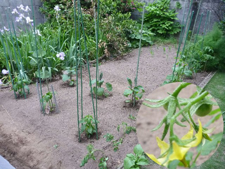 定植して保護用ビニール袋を外しました。トマトは第一果の花が咲き小さな青トマトになっています。