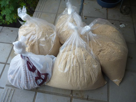 綾瀬蕎麦友が米糠と削り節残滓を届けてくれました。埼玉菜園まで運び積んで落ち葉に混ぜて発酵を促します。