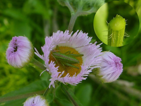 夜間は冷え込むのでしょう!ハルジオンを風よけとベッド代わりにキリギリスの幼生が眠りについていました。