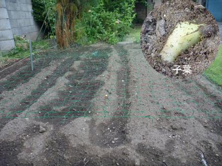 秘伝大豆播種後に恵みの雨あり。地面に亀裂ありで穿ると膨らんできた子葉を確認しました。地上へ顔を出した子葉は栄養豊富で野鳥が待ち構えており、ネットを張り防御します。