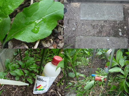 所が一部にヒメジオンの群生あり。一度除去したのですが根を残すとエイリアンみたいに再生してきます厄介者です。右上の画像はヒメジオンに悩まされた場所です。試しに5/19日、草からし原液をスポイトで一滴一滴塗布したらその後の再生が見られませんでした。