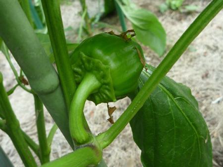 病気を疑われている一角にはナス三種・ピーマン・唐辛子・パプリカ・キュウリ2本・トマト5本を育てています。この画像はパプリカです。ピーマンは開花から15~20日で収穫ですが、パプリカは倍の40~50日もかかりますから生産コストが高くなります。吝いですがせめて安全保証付きの自前国産パプリカ1個収穫出来れば苗代の回収です。