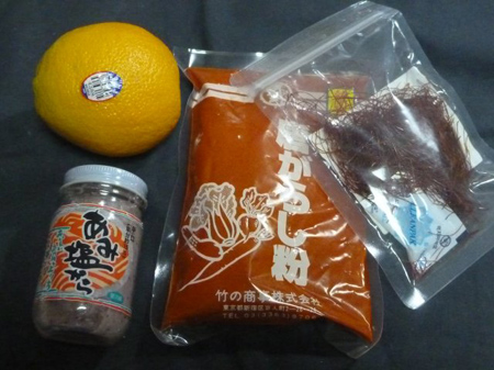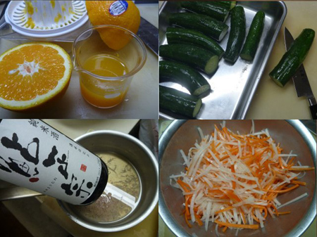 先ずは粗塩で板摺りし1/2切り、両端を残した十字に包丁を入れます。大根と人参を千切りと致し、一塩しておきました。アゴ出汁にアミの塩辛と砂糖を加えます。おっ~と!日本酒が鮎正宗純米酒しかありません。ま~ぁ!材料は良いほど美味しいと思います。沸騰直前に火を止め粗熱を取りましてからオレンジ果汁を加え、ニラのみじん切りを加えた野菜等と合わせました。好みで塩梅の確認をしておきます。
