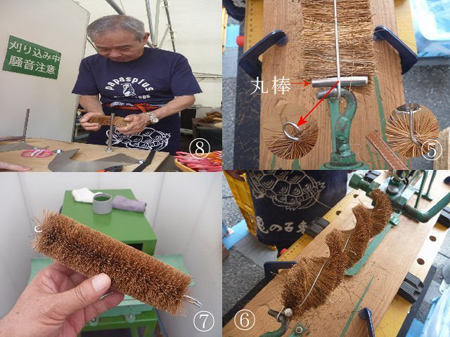 ⑤椰子繊維を均等に挟み込んだら、手前に丸棒を差し込みますと丸棒の太さの輪が出来ます。⑥徐々に捻りを加えていきます。⑦捻り終わりました束子棒ですね。繊維の並び方が不揃いですから「刈り込み器」を通すと散髪直後の髪と同じですね。⑧中心を見極め直立棒でU字に曲げます。