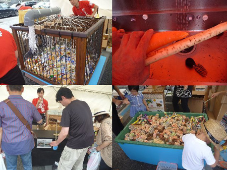 おじさん達は童心に戻りたわしの泥落とし効果を体験後、野菜を戴き、今晩はきんぴらでしょうか?20秒制限のたわし釣りは時間との勝負でした。参加者の一人が、剣玉は得意ですからと2回のたわし剣玉に挑戦し有言実行の2個をGet。昔、駄菓子屋で大玉の飴を引きたかったヒモくじの亀の子版でした。