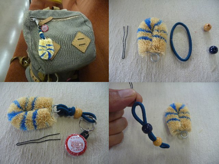 ⑨U字型の治具に差し込み椰子縄を巻き込みます。⑩縄のよじれを緩め針金の輪に通したら縄を切断します。⑪ペンチで針金同士を絡めます。⑫手提げ袋へ入れて戴き完成です。