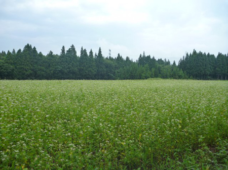 十日町農園から少し下った道沿いに蕎麦畑が広がっています。品種は在来種なのでしょうね。国産玄蕎麦は人気で納め所は決まっていると訊きます。