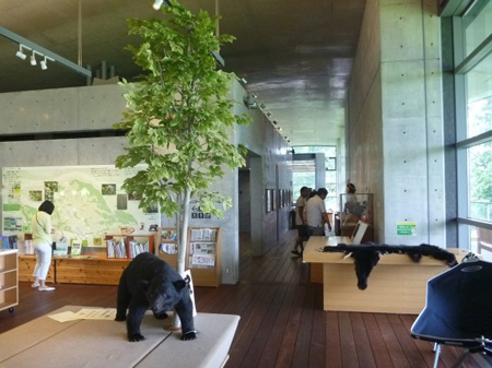 安藤忠夫氏設計の森のホールを見学。ヒグマの剥製あり。ある日、十日町農園に着く頃には夜となりヘッドライトが小熊を浮かび上がらせた事があり、小熊が居れば近くには親熊が居ます。悟られないようその場を立ち去ったと話します。