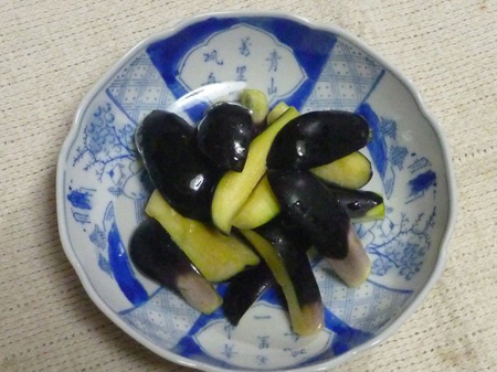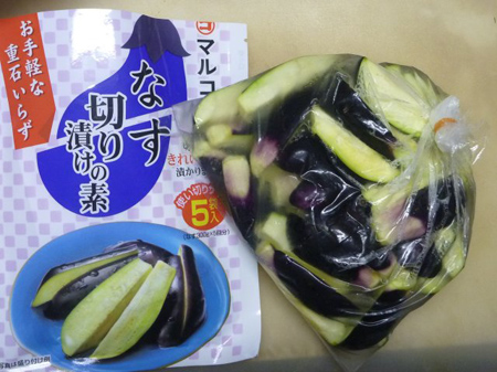 茄子はすぐに切り口が変色します。先に漬け物の素を200ccの水で溶かしておけば変色を防げます。