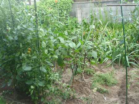 2週間のご無沙汰の間に野菜ジャングルと化し春植え胡瓜を処分し、トマトの脇芽を摘みます。