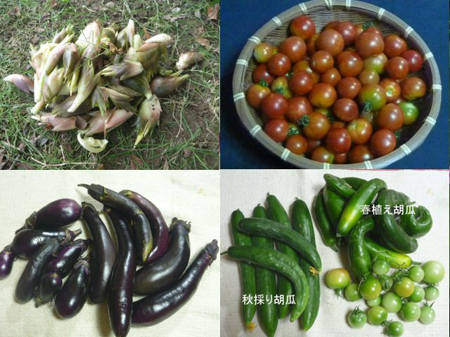 ご近所へお分けしても深笊一杯のトマトです。春植え胡瓜と秋採り胡瓜を持ち帰ります。