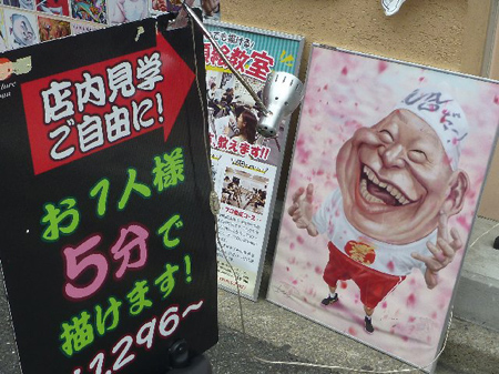 浅草仲見世はゴッチャゴチャ!!歩くのも大義です。側道を通りますとデホルメされた元気なおじさんが笑いかけています。似顔絵描きのお店のようです。