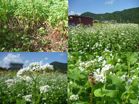 8月5日に蕎麦を播種して一月、青野原&青根に一番花が咲き始めました。此より順次花芽が育ち小昆虫の助けを借りて受粉されます。