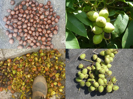 道志川支流に胡桃の樹あり。収穫を知らせる腐敗が果皮に見られるようになり持ち帰りました。自宅で踏みつぶし果皮を剥きます。非常にアクが強いので素手は禁物。ほどほどにして置き水に浸して残った果皮を腐敗させます。綺麗になったところで陰干しして保存します。