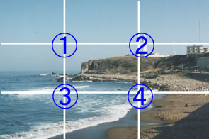 画面構成上、空間、ゆとり、バランスなどがよいといわれてるのが3分割法で、これは参考になります。画面を上下左右に3等分して交わった4点のところに、ポイントを置くとバランスよくまとまります。