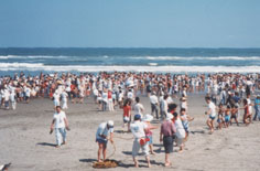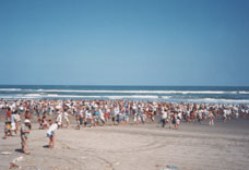 2枚の写真を比較してください。水平線が中央にあると、人がたくさんいるのは判断できても、空に目が半分奪われてしまい、写真が散漫になっています。画面を2分割しない方が良いというゆえんです。一方の写真は、若干ハイアングルからになっていますが、人が主役になっています。