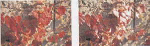 *色補正を行うフィルター=CCフィルターと呼ばれ、[色を変える]効果があります。色彩コントロールと同類に扱われますが、根本的には異なります。よく蛍光灯の色補正(左の写真 上:使用 下:未使用)に使われ、また例えば、緑色を強調する時には薄いグリーンのCCフィルターを使用します。