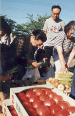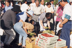また、朝市の写真では横位置が50mmの焦点でほぼ水平。縦位置が28mmでトマトを主題に大きく撮ってみました。いずれも市であることは分かりますが、迫力という点ではトマトをメインに置いた広角系にあることがおわかりでしょう。