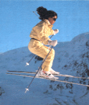 また、ゲレンデを滑降したり、ジャンプしたりの撮影では、ISO 400 のフィルムを使用て高速シャッターを駆使したいですね。右側の写真は1/2000秒で撮影しています。人物がピタリと止まっている写真が撮れます。こうした時の被写体は、カメラマンが座ったりて低い位置からの方が迫力ある写真が得られやすいものです。