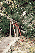 『孝行鳥居』年老いた親鳥居を子の鳥居がけなげに支えている。しかし、子供にも疲れがみえて赤い肌も剥げかかっており、参拝者の憐れみを誘う。香川県の土庄町にて。