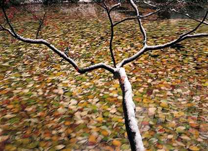 珍しく東京に雪が降った。朝一番に新宿御苑へ入園すると、人気のない御苑の片隅で、ドラマチックな場面に遭遇した。池に溜った落ち葉がゆっくりと移動していた。