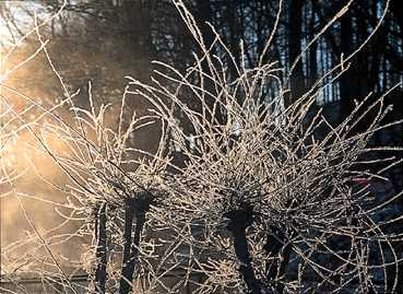 忍野では二、三百人ものカメラマンが赤富士を狙っていた。そこで私は川沿いの霧氷に狙いを絞って撮影した。