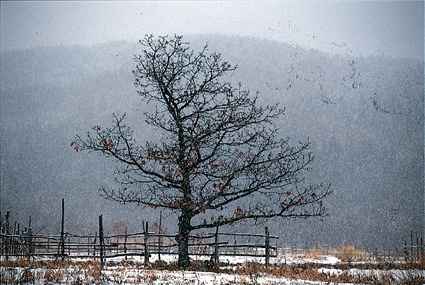 車を走らせていると、一本の椎の木が孤立していた。雪がしんしんと降り続いて寂しさを助長していた。その気持ちをそのままフレーミングした。