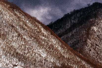 冬の山肌は、枯れ木を浮き上がらせる。斜面のグラデーションと稜線のコントラスト、そして垂れ込めた冬の雲の色彩を、画面の中で合わせて楽しんだ。