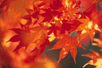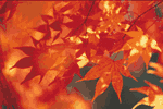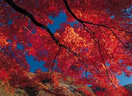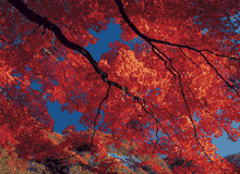 カエデの色合いを巧く引き出すには、順光の場合はPLフィルターを使って、葉の表面反射を除去する。逆光の場合は多少プラス側に露出補正して、葉を通した光の色合いを捕らえる。(長野県鬼無里村)
