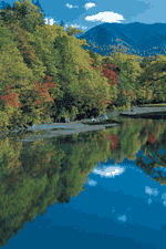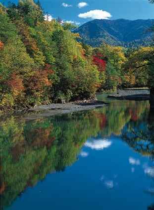 北海道の紅葉は早い。これは十勝平野の奥、新得町のトムラウシの紅葉。美しい渓流と岸辺の木々との対比が見事である。(北海道新得町)