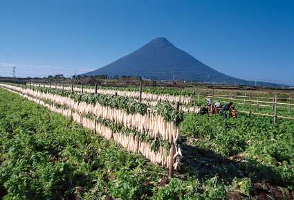 手前にずらりと並んでいるのは大根を干してあるのです。大根のパースと背景の山の稜線のバランスでまとめました。