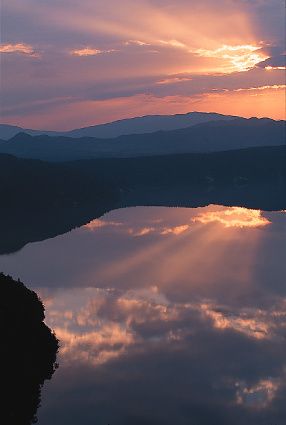 | 夕方、摩周湖に登ってみた、夕日と雲がとても美しく輝いていた。初秋の9月下旬のことであった。 ■カメラ:キヤノンEOS-1N レンズ:EF70-200mm F2.8L シャッタースピード:1/50秒 AE フィルム:RVP PLフィルター・三脚使用 撮影地:北海道弟子屈町 摩周湖 |