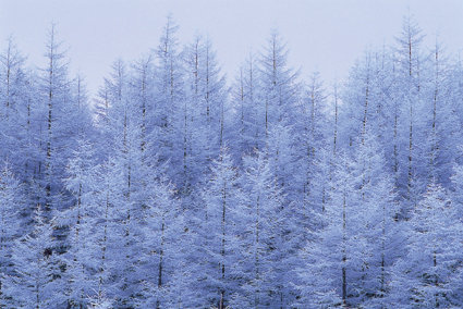 薄暮の状況で撮影した樹氷。この樹氷は寒波の到来でわずか2、3時間で化粧されたもの。霧の晴れたわずかな間に撮影した。