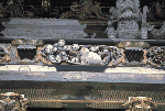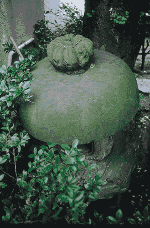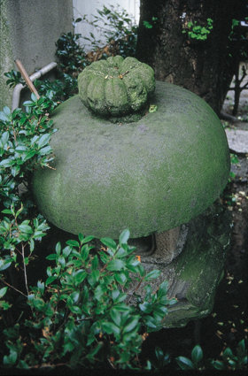 石灯籠の上に変なものが乗っているな、と思ったら、石で彫られたカボチャだった。(千住)